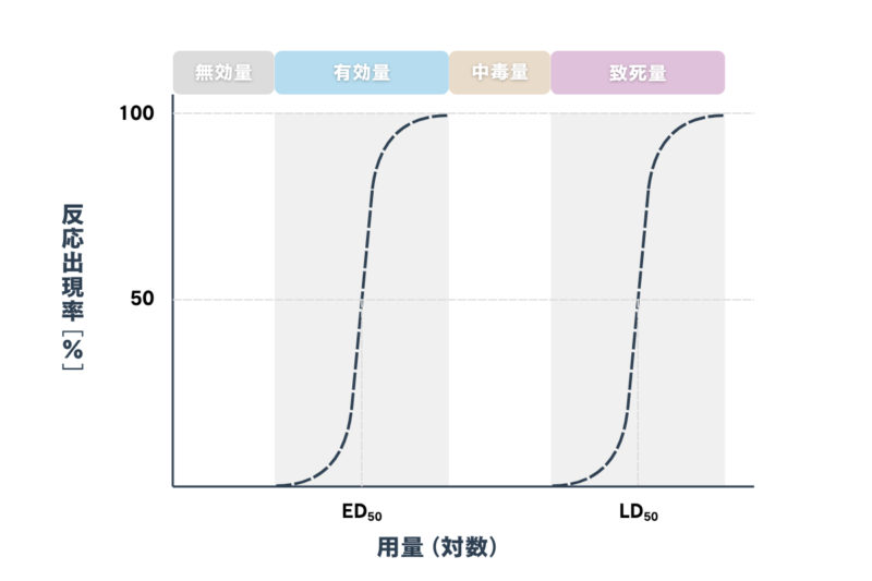 薬物が有効な治療効果を示す「有効量」のうち、50%の動物で治療効果が得られる量を「50% 有効量ED50 〉」、また死に至らしめる量のうち、50%の動物が死に至る量を「50% 致死量LD50 〉」といいます。
