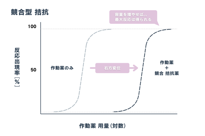 競合型 拮抗」の強さの指標を「pA₂ 値」といいます。「pA₂ 値」が大きいほど、強い競合拮抗薬であるといえます。